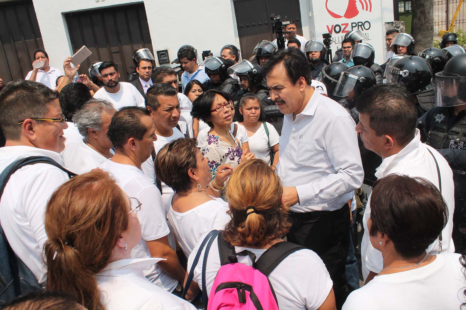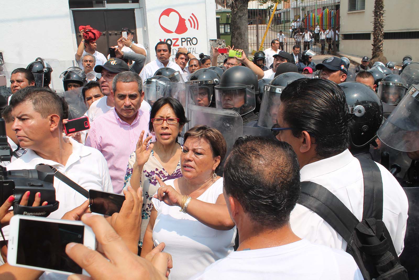 Al notar la resistencia, llegó un grupo de unos 100 policías del Mando Único, formando una barrera, sin embargo estos no aplicaron ningún acción. «No entiendo porque nos mandan a estos elementos, nosotros no somos ningunos criminales, solo estamos exigiendo lo que por ley nos corresponde», recalcó Leticia Castro.