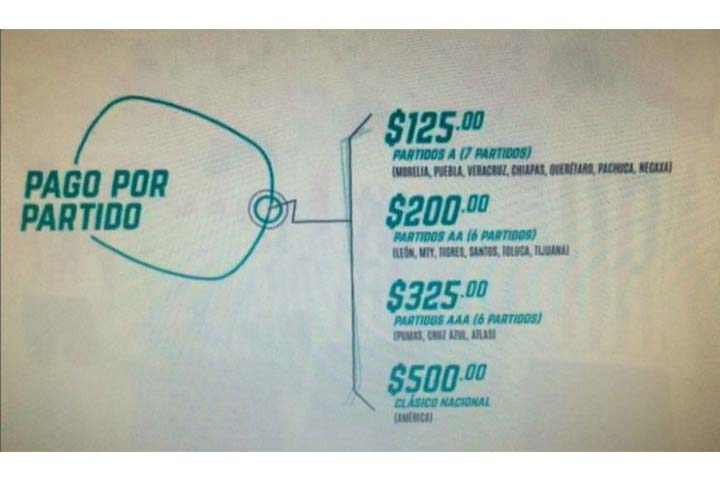 El costo de todos los juegos por un año será de 2 mil 750 pesos, pero si sólo es por seis meses o únicamente un torneo, será de mil 550 pesos. Por partidos sueltos será de 125,200 y 325 dependiendo de la calidad del rival; el clásico, estará en 500 pesos.