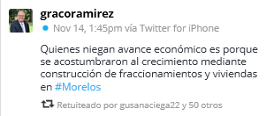 Sorpresivamente, aunque el gobernador había firmado y enviado ese documento al Congreso, desde el 1° de octubre; el 14 de noviembre, mes y medio después, en total contradicción a lo que el mismo había firmado en un documento oficial, declaró: Quienes niegan avance económico es porque se acostumbraron al crecimiento mediante construcción de fraccionamientos y viviendas en Morelos.