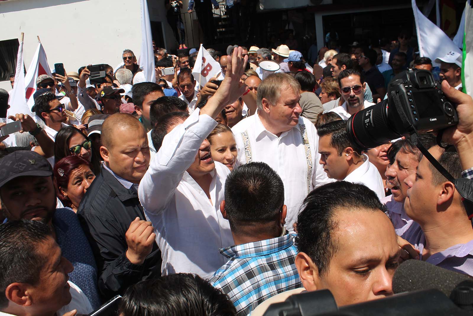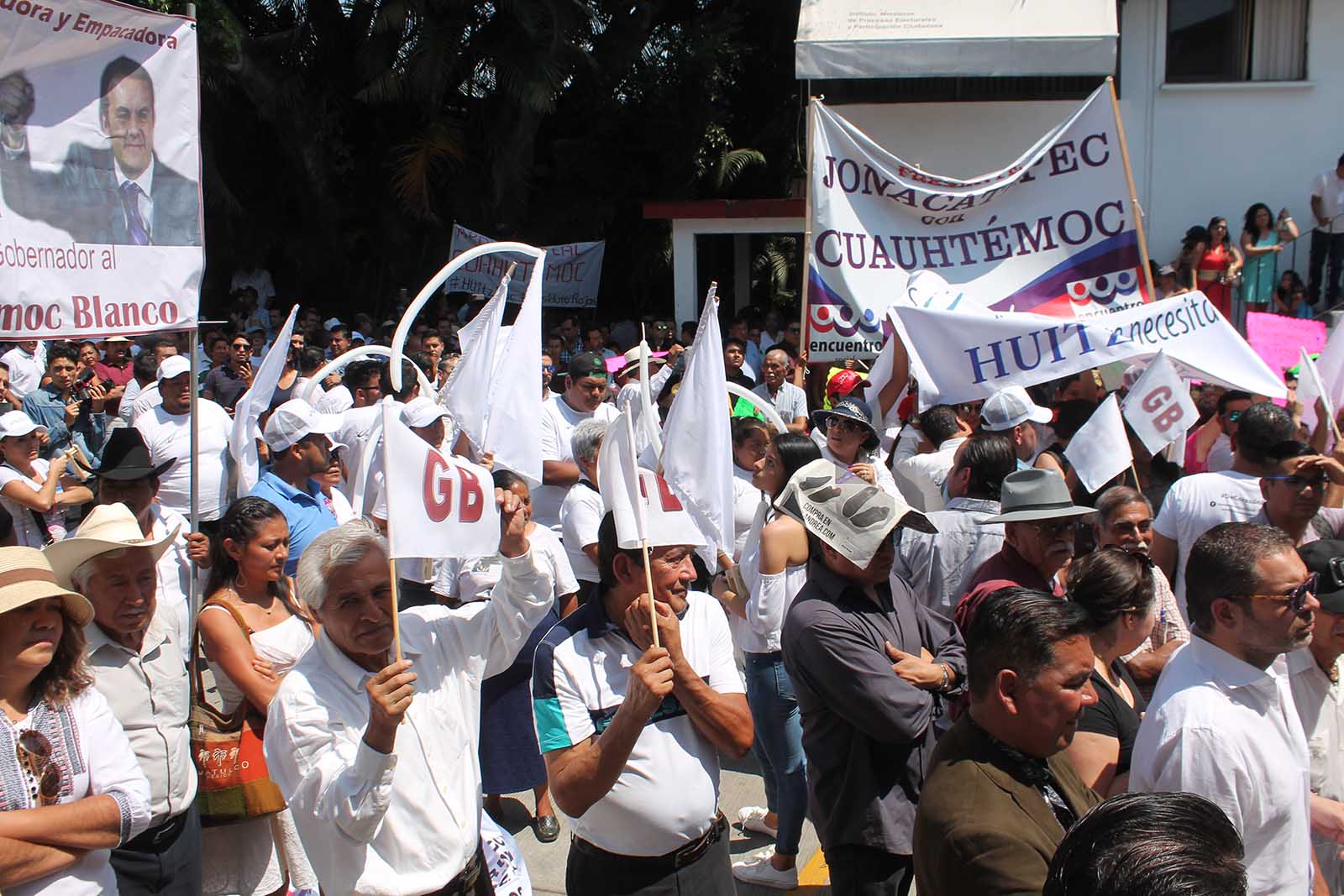 Desde las 11 horas del domingo militantes de los tres partidos se dieron cita en las instalaciones del órgano electoral en espera del ex futbolista, quien será su candidato a la gubernatura. A su llegada comenzaron a escucharse porras tale como: “Cuauhtémoc, tú serás nuestro gobernador”; “Vamos Cuauhtémoc, tienes nuestro apoyo”; “Te queremos ver ganar”; entre otras.