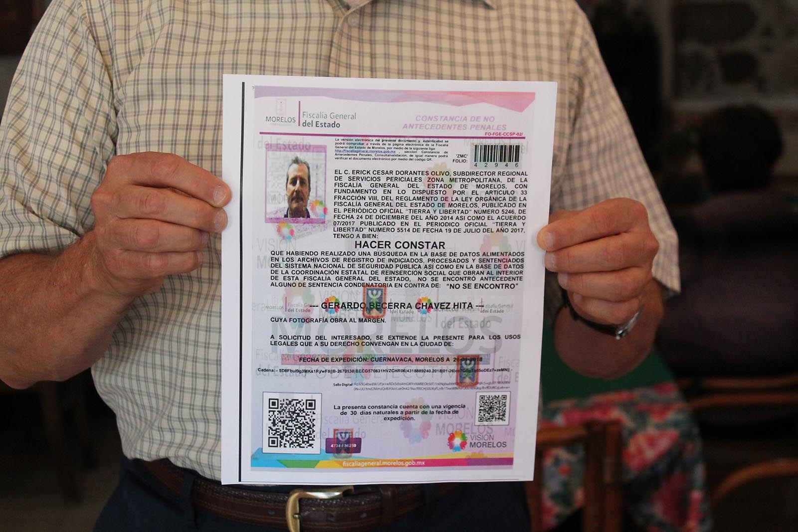 Ante ello, este miércoles el también fundador de la Coordinadora Morelense de Movimientos Ciudadanos (CMMC) presentó una carta de antecedentes no penales, emitida por la Fiscalía General del Estado, con la que demostró que no tiene ninguna demanda en su contra.