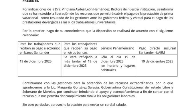 Los seis mil trabajadores de la Universidad Autónoma del Estado de Morelos (UAEM) solamente recibirán el pago de la prima vacacional, mientras que su aguinaldo quedo pospuesta su entrega hasta la «obtención de los recursos extraordinarios», informó mediante un oficio la secretaria General de la institución, María Delia Adame Arcos, por «instrucciones» de la rectora Viridiana Aydeé León Hernández.