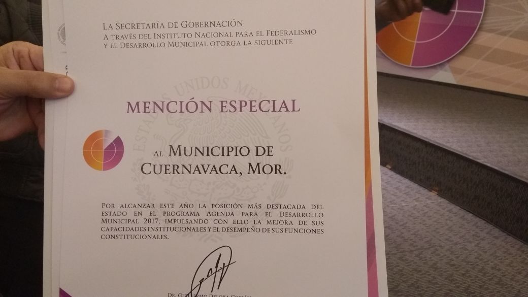 La Secretaría de Gobernación, a través del Instituto Nacional para el Federalismo y Desarrollo Municipal, hizo una mención especial al municipio de Cuernavaca por mejorar los procesos administrativos y por ser más eficiente en la atención ciudadana.