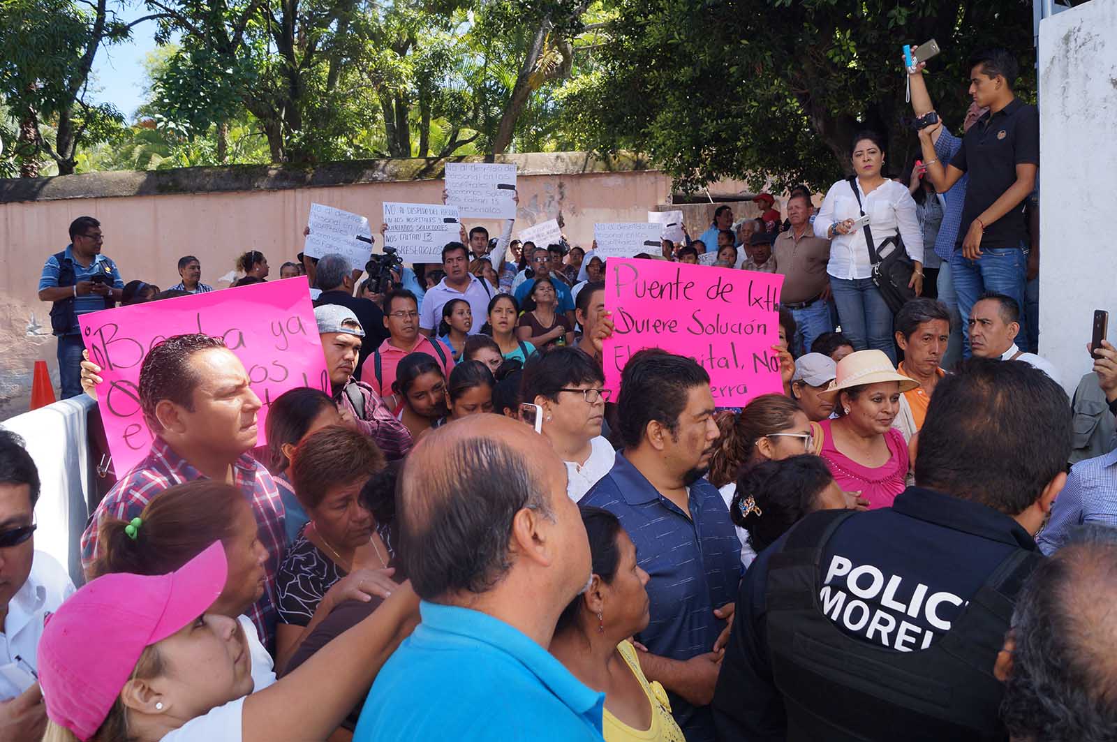 Habitantes del municipio de Puente de Ixtla encabezados por la diputada federal Rosalina Mazari Espín, se manifestaron en las instalaciones de Servicios de Salud para exigirle a la doctora Patricia Mora González, titular de la Secretaría de Salud, y al gobierno del estado detener los despidos de personal médico del hospital comunitario de este municipio.
