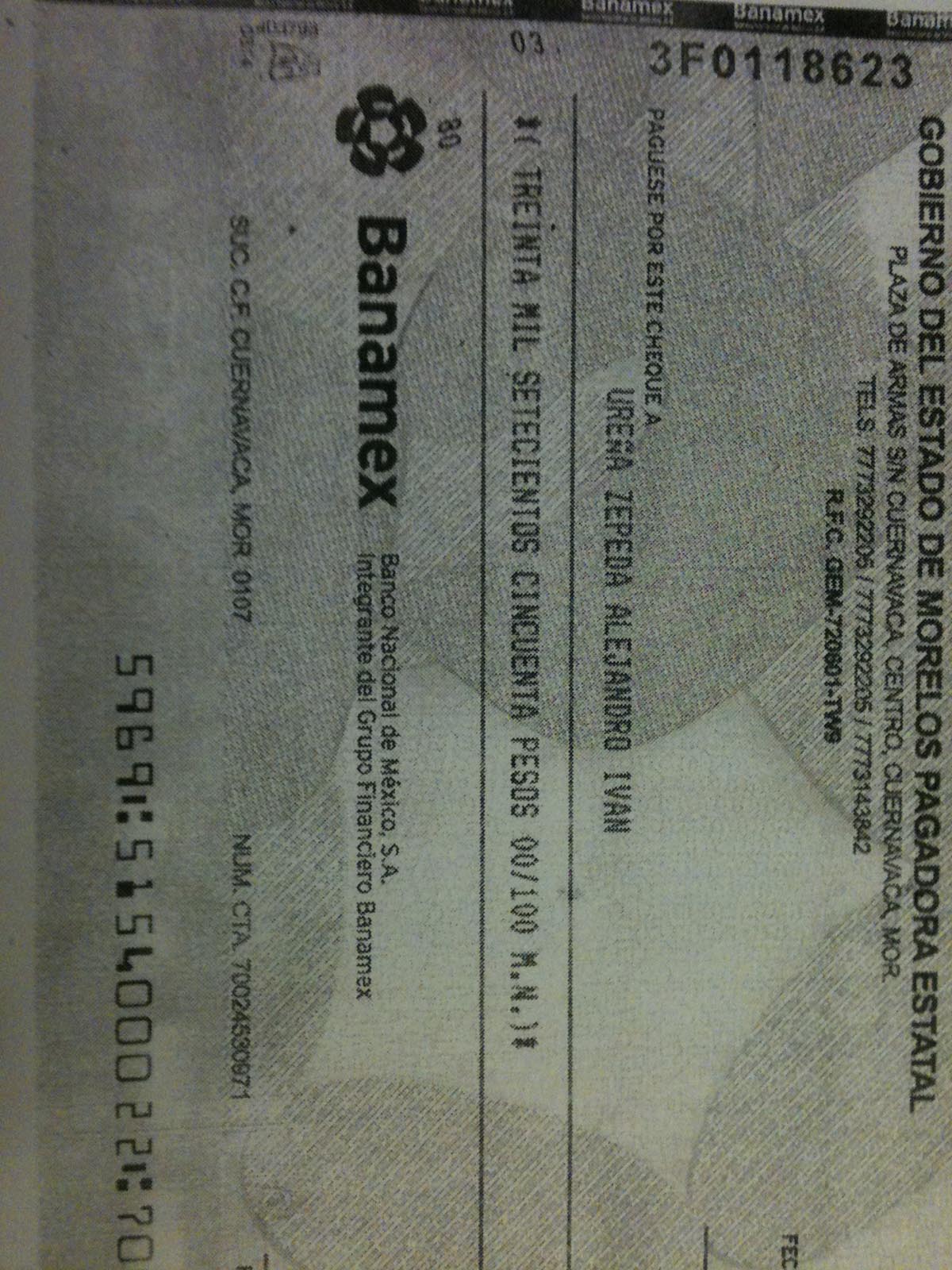 El lunes 25 de agosto del 2014, se cumplieron 444 días de que la Secretaría de Movilidad y Transporte de Morelos paró y multó tres unidades de la empresa conocida comercialmente como Tren Turístico; sin embargo, ese mismo día el banco me hizo efectivo el cheque No 0037030 por $30,750.00, emitido por el GOBIERNO DEL ESTADO DE MORELOS PAGADORA ESTATAL en favor de UREÑA ZEPEDA ALEJANDRO IVAN. La razón: un juez declaró improcedente la multa de tránsito, No.3343. Lo mismo había sucedido con las multas No. 3347 y 3348, y fueron pagadas con los cheques No. 0029330 y 0030842.