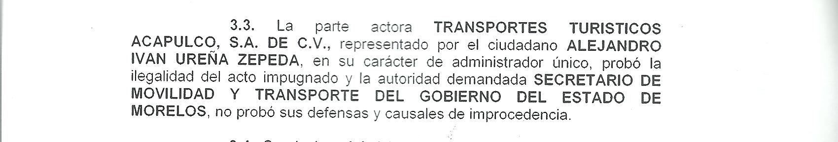 • 3.3 La parte actora TRANSPORTES TURISTICOS ACAPULCO, S.A DE C.V., representado por el ciudadano ALEJANDRO IVAN UREÑA ZEPEDA, en su carácter de administrador único, probó la ilegalidad del acto impugnado y la autoridad demandada SECRETARIO DE MOVILIDAD Y TRANSPORTE DEL GOBIERNO DEL ESTADO DE MORELOS, no probó sus defensas y causales de improcedencia.