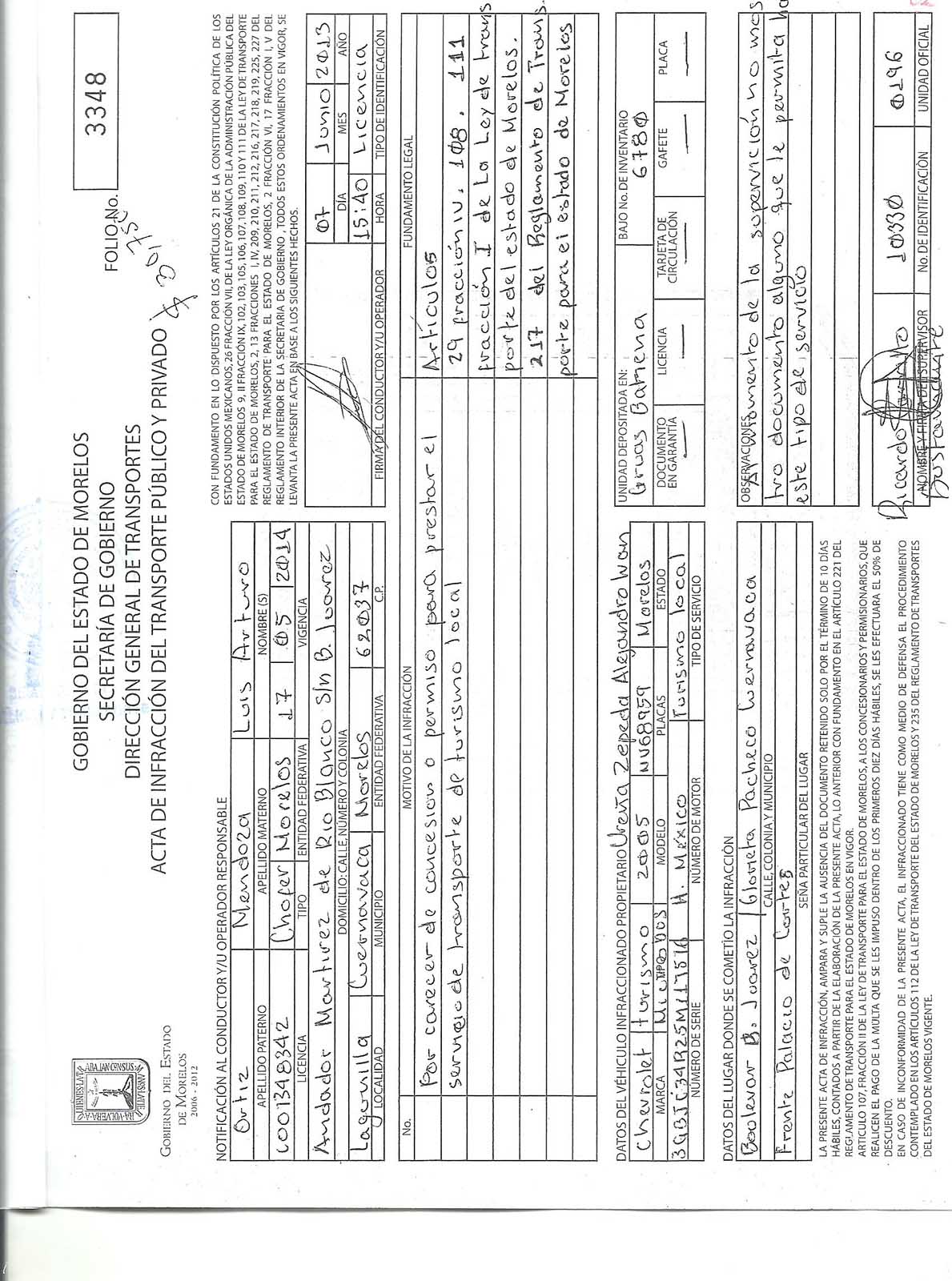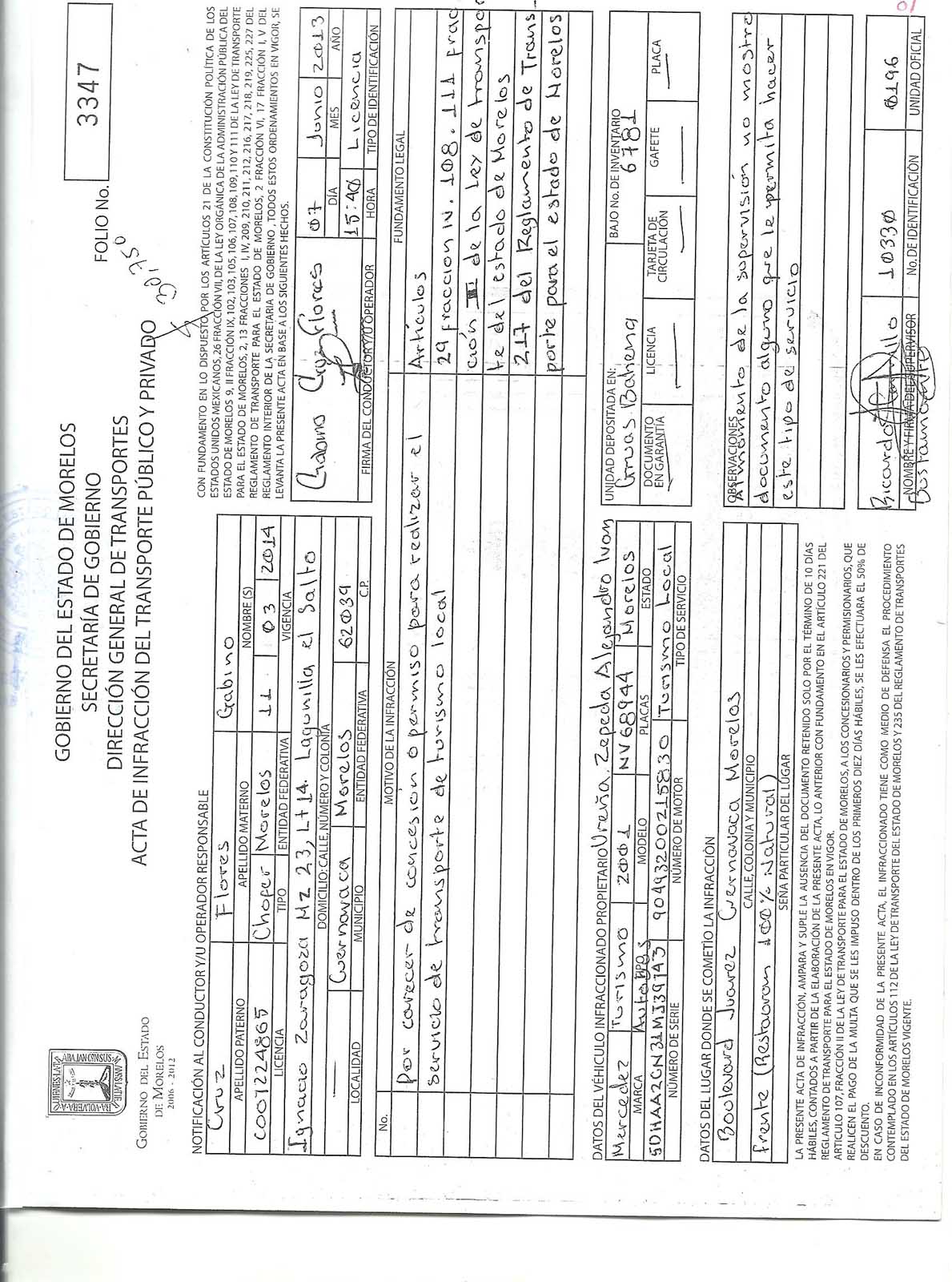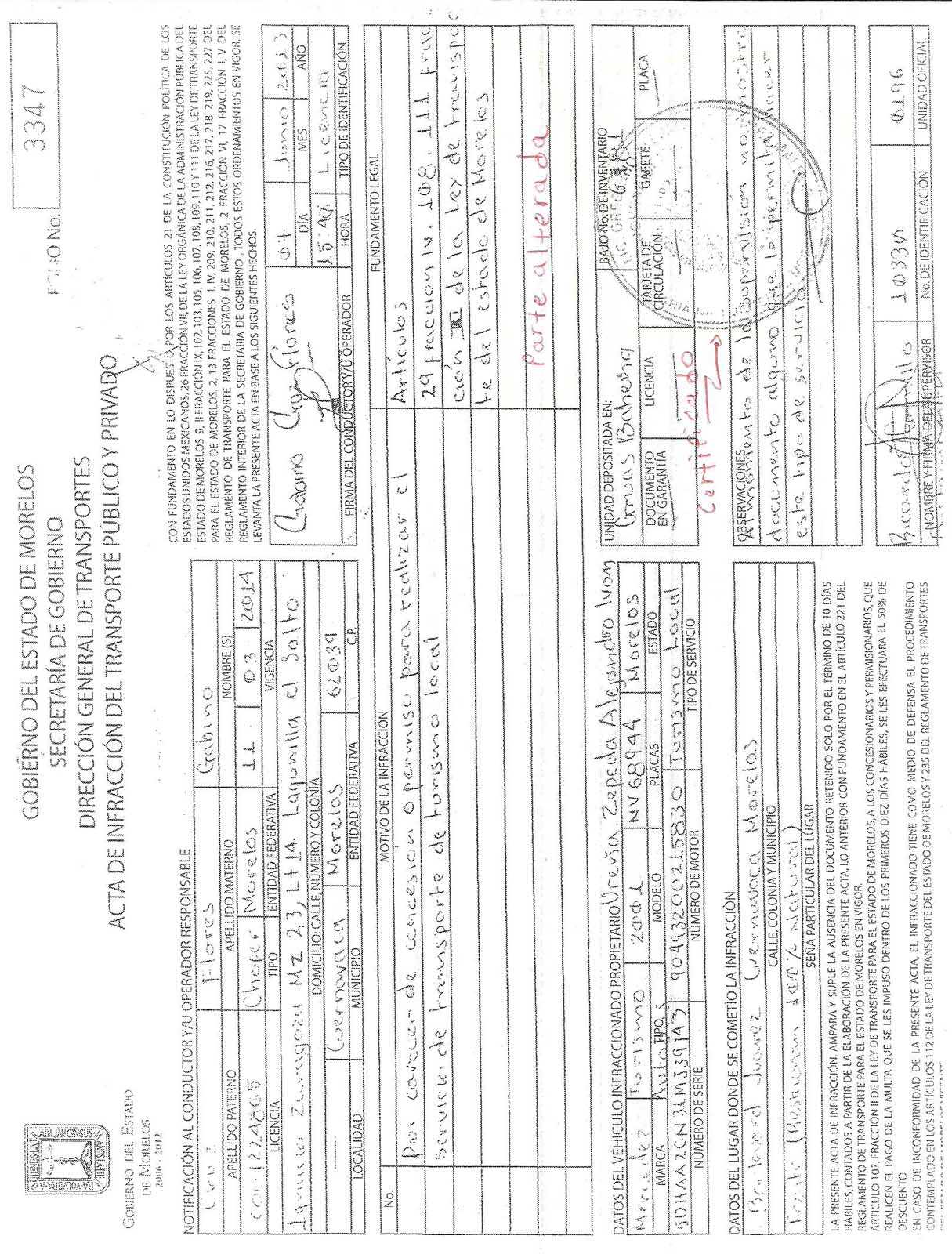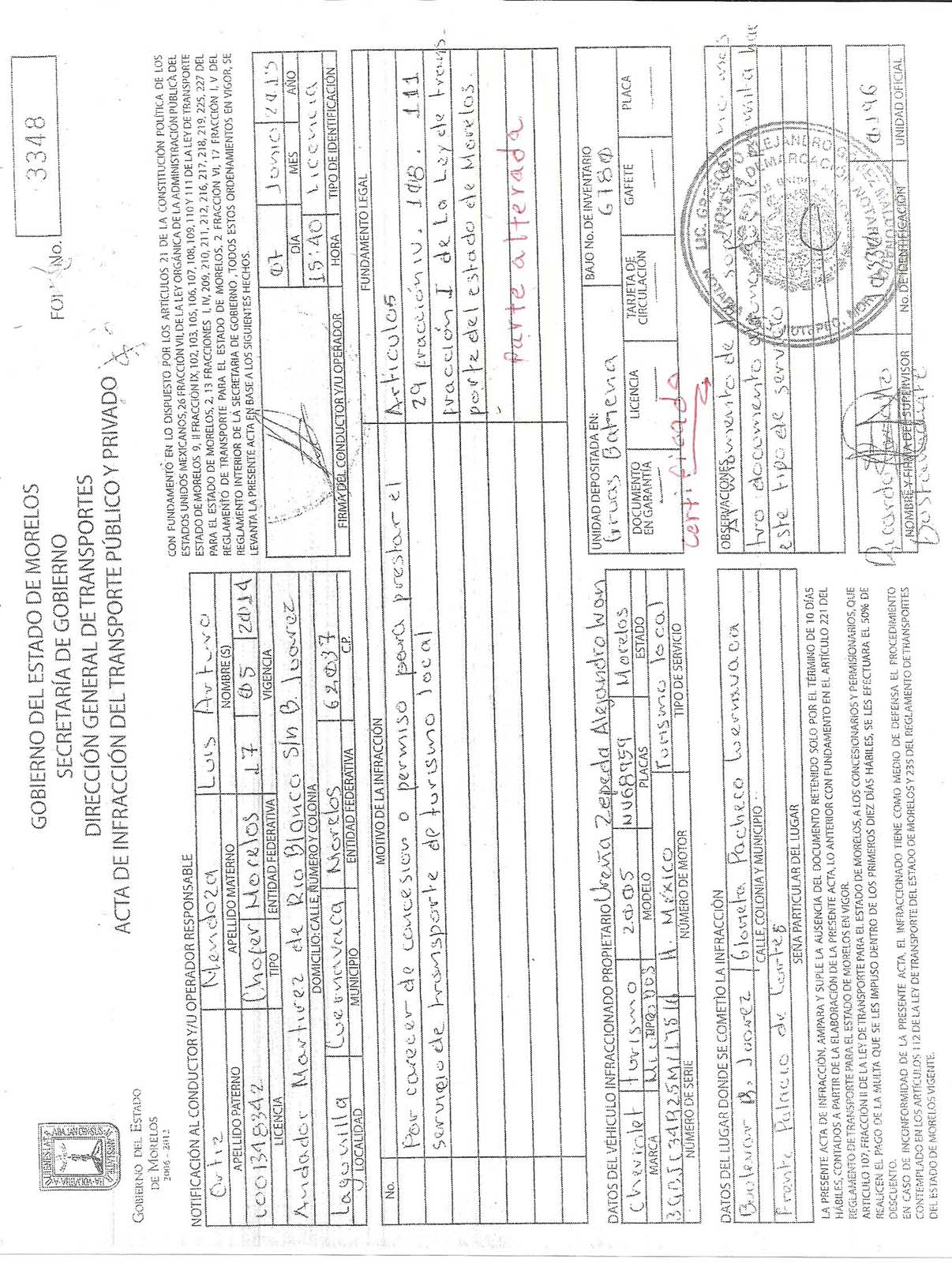 Pero hay tal inquina de la autoridad, que alteró documentos oficiales. Las Actas de Infracción No. 3347 y 3348, fueron modificadas, originalmente decían, Fundamento Legal: “Artículos 29 Fracción IV. 108.111 Fracción II de la Ley de transporte del estado de Morelos” como lo constató el Lic. Gregorio Alejandro Gómez Maldonado, Notario público número Uno, el 26 de Junio del año 2013. Pero esas mismas infracciones, obtenidas de la Secretaría de Movilidad el día 26 de mayo del 2014, mediante Oficio Núm. 239/V/2014  tenían otras leyendas: “Artículos 29 Fracción IV. 108.111 Fracción II de la Ley de transporte del estado de Morelos 217 del Reglamento de Transporte para el estado de Morelos” Le agregaron la frase 217 del Reglamento de Transporte para el estado de Morelos, lo que evidentemente constituye una alteración de documentos oficiales.