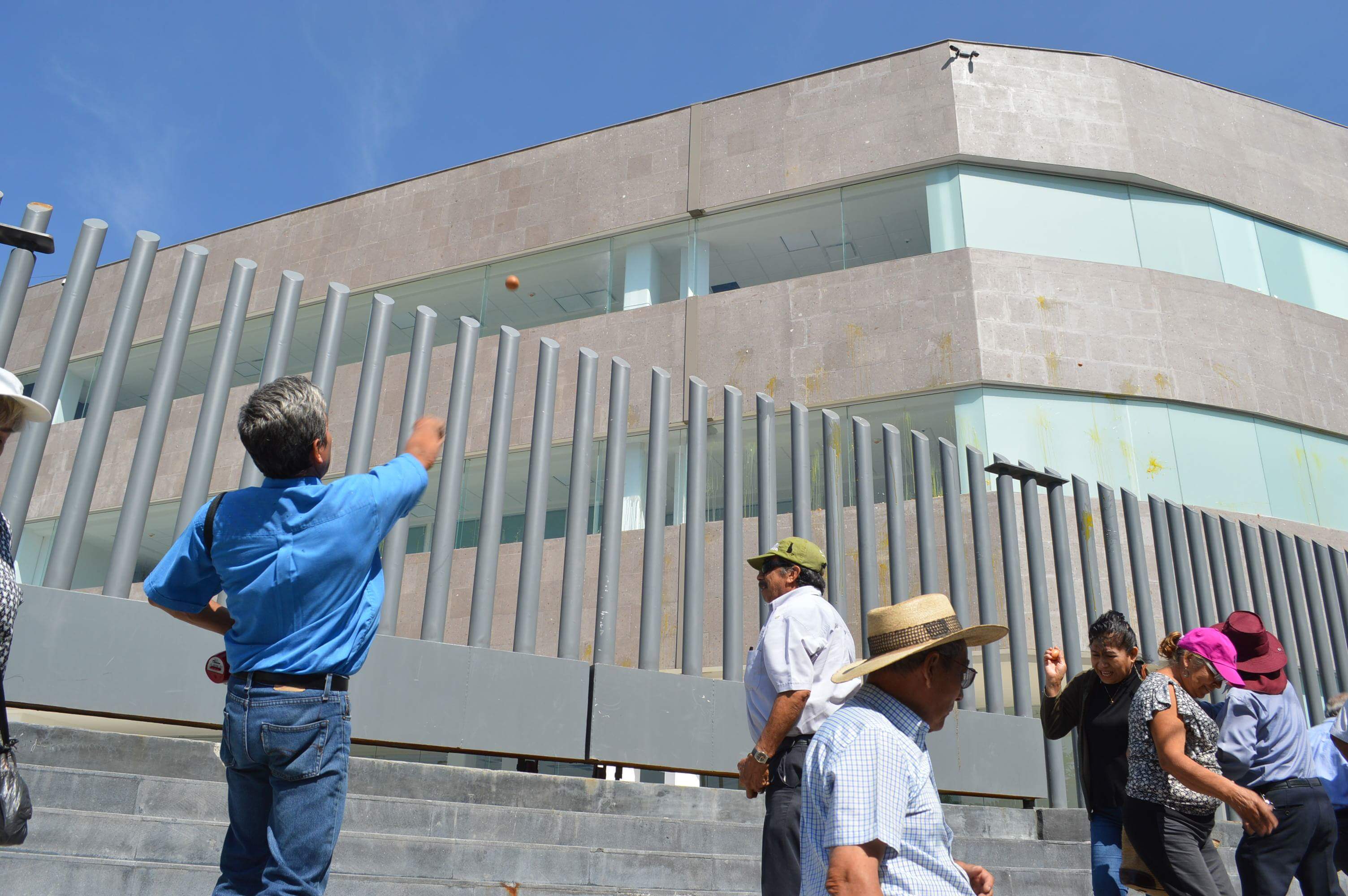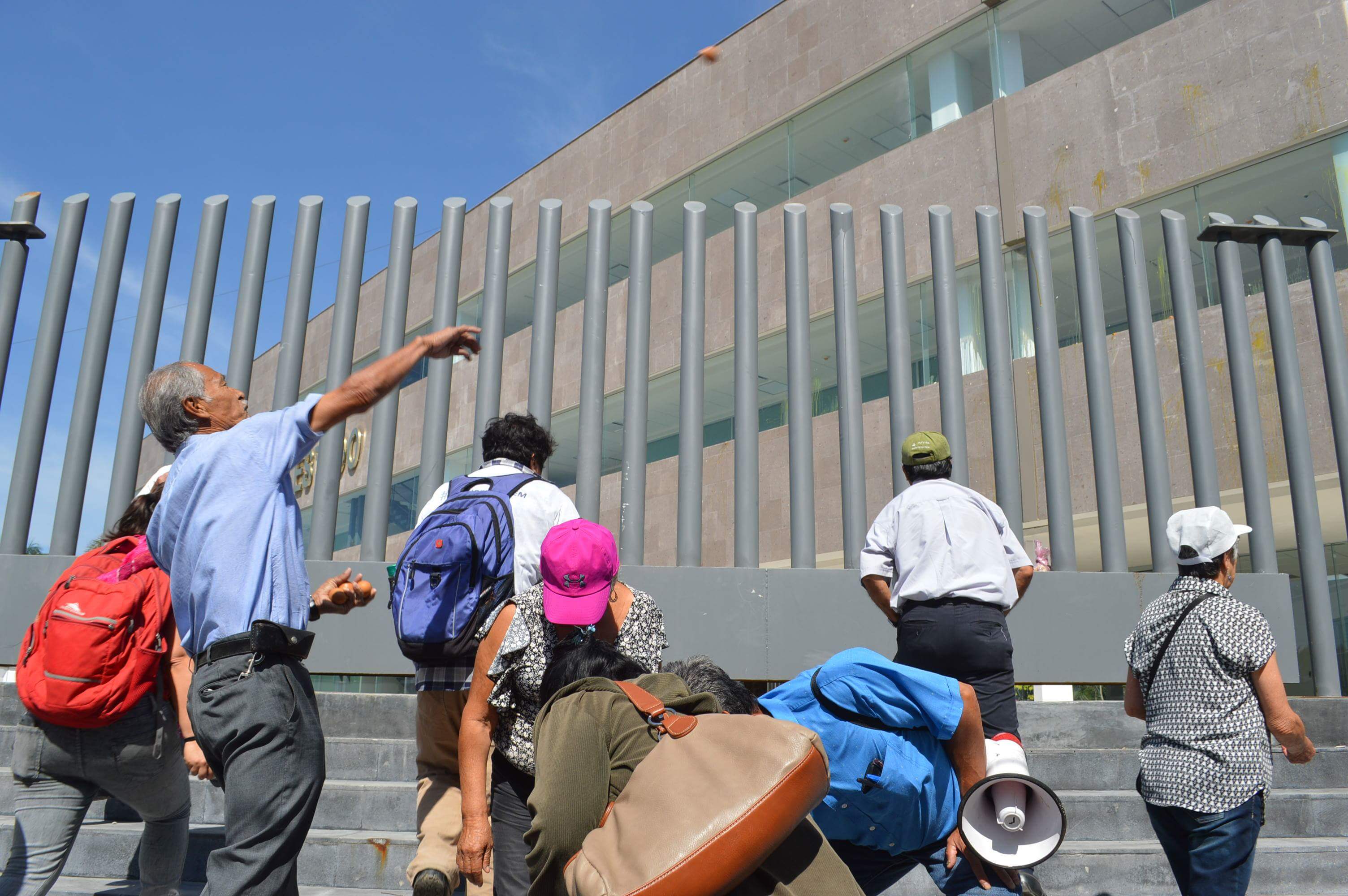 Integrantes de la asociación cívica morelense “Gustavo Salgado Delegado” arrojaron decenas de huevos al recinto legislativo del estado de Morelos en señal de inconformidad por las reformas y jubilaciones ‘doradas’ que aprobaron los diputados en las últimas sesiones.