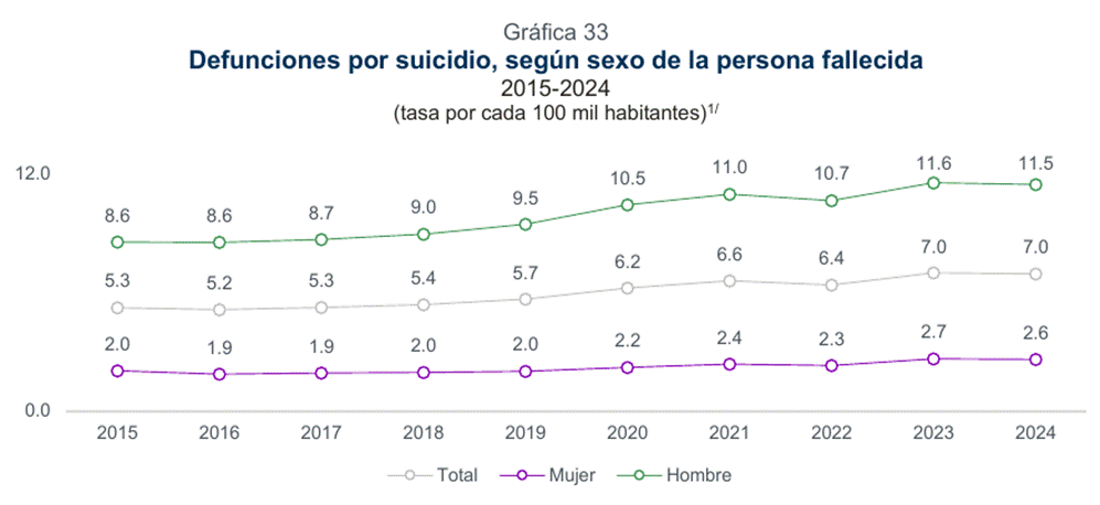 La tasa de suicidios ha crecido notablemente durante los años de la 4t, y la gráfica siguiente lo ilustra con mucha claridad; de 2015 a 2018 se observa cierta estabilidad pues solo aumenta en una décima la tasa por cada 100mil, pero en 2019 salta 3 décimas para llegar a 5.7 y sigue aumentando hasta alcanzar 7.0 en 2023 y 2024. La gráfica también evidencia que es particularmente virulento entre los hombres (80.6%) y mucho menos entre las mujeres (19.4%). Los jóvenes de 15 a 24 años concentraron el 23%, y los de 25 a 34 años el 27.4%.
