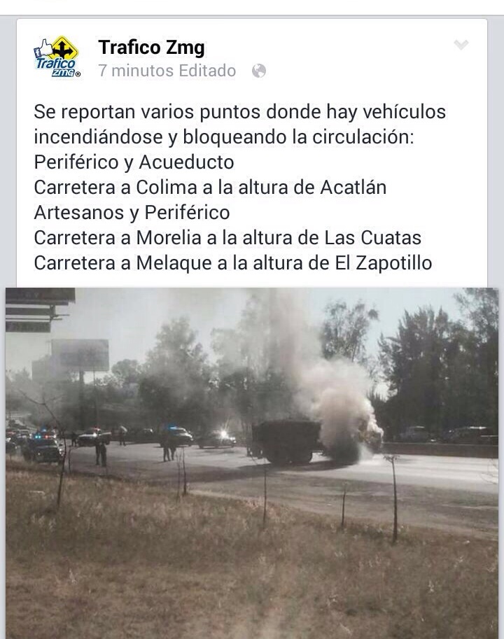 Los puntos confirmados son: Av. Revolución y Matamoros, Periférico y Colón, Patria e Isla Antigua. carretera a Chapala a la altura del Aeropuerto, Periférico y Acueducto y la Carretera libre a Zapotlanejo a la altura de Tateposco.