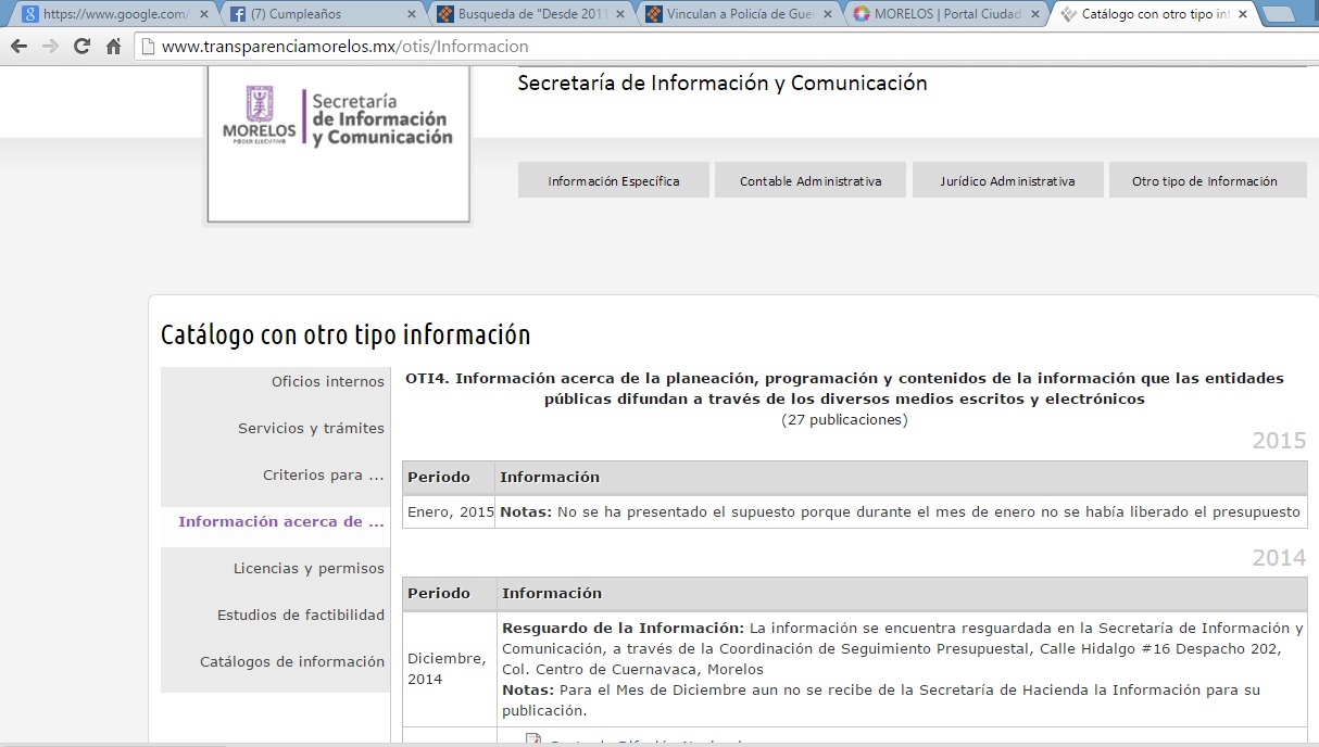 Así contestó la Unidad de Información Pública de la Secretaría de Información y Comunicación Social del Gobierno estatal a una solicitud hecha por este reportero para conocer el monto de los recursos destinados al rubro de la imagen del gobernador Graco Ramírez. Esto también puede ser corroborado en la página oficial http://www.transparenciamorelos.mx/otis/Informacion, donde se puede leer: “para el Mes de Diciembre aun no se recibe de la Secretaría de Hacienda la Información para su publicación”.