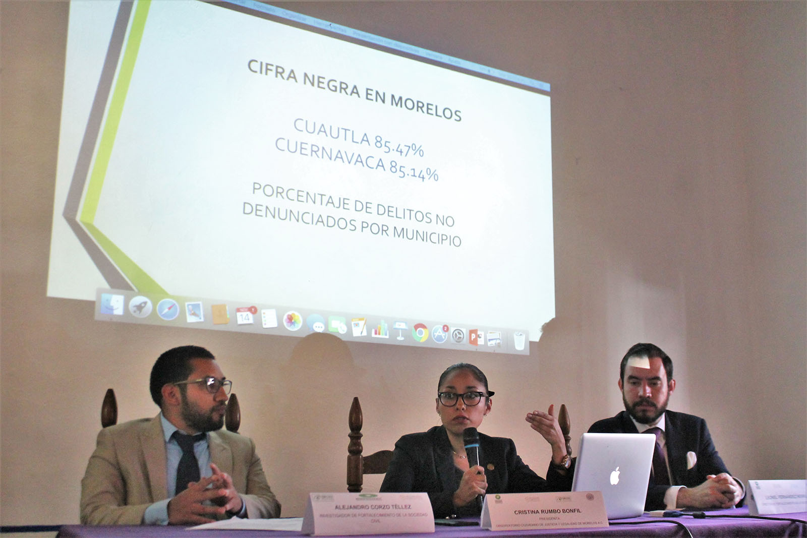 Cristina Rumbo Bonfil, presidenta del Observatorio, dijo que lo anterior se ve reflejado tras realizar la encuesta de «Victimización y cultura de la legalidad en Morelos 2017», la cual se aplicó en los municipios de Cuernavaca y Cuautla por su densidad poblacional, pero también se realizó en otras entidades.