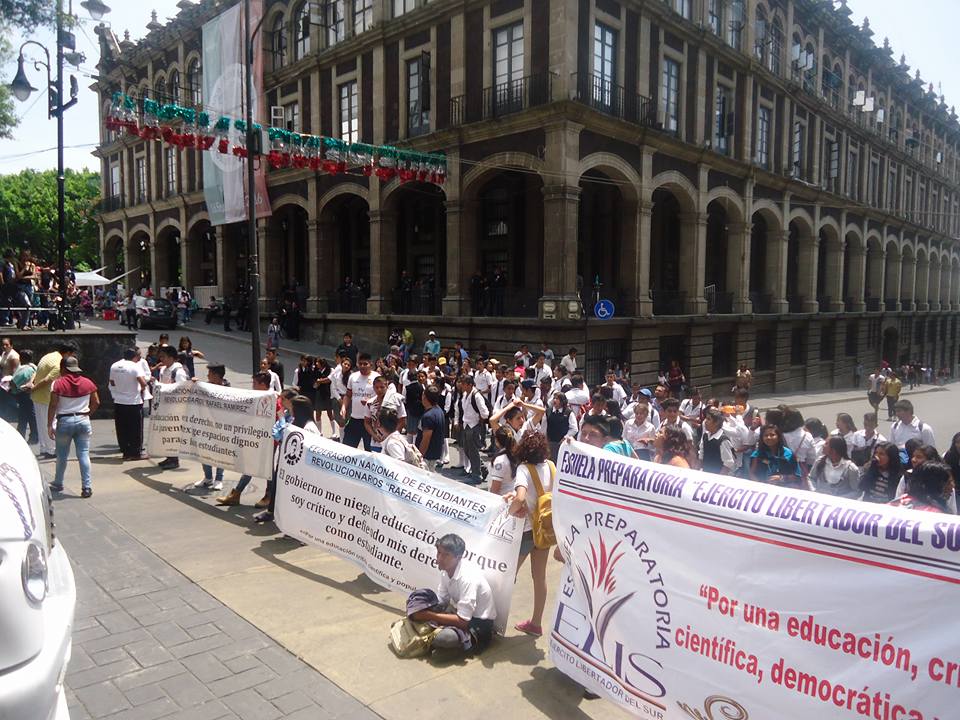 Con una barrera de policías del Mando Único con equipo antimotines en las entradas de la recién remodelada Plaza de Armas «Emiliano Zapata» impidieron que alumnos de la escuela preparatoria «Ejercito Libertador del Sur» se manifestaran libremente sobre esta explanada.