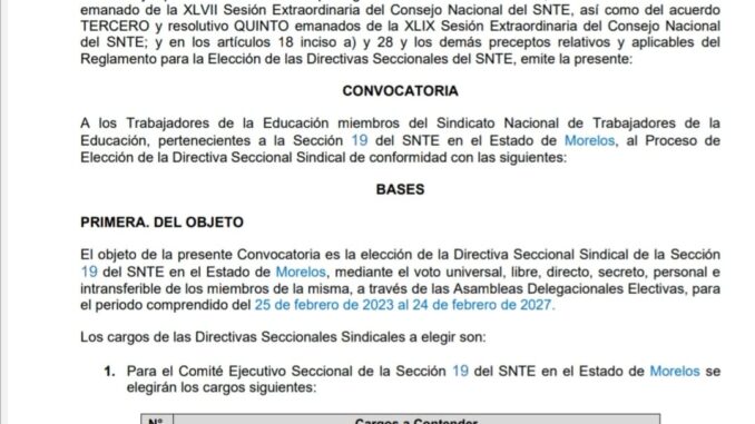Después de un retraso de tres años fue emitida la convocatoria para el relevo en la dirigencia del Sindicato Nacional de los Trabajadores de la Educación (SNTE) en Morelos, que será realizada el 21 de febrero con el voto libre y secreto de los aproximadamente 35 mil integrantes de la organización en el estado.