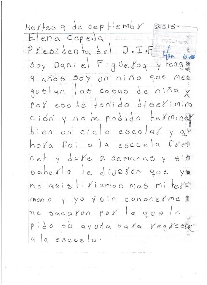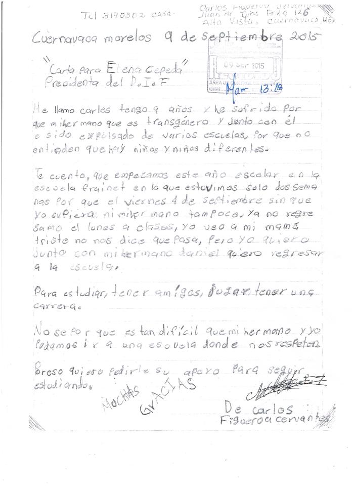 Luego de que el 9 de septiembre Daniel y Carlos hicieran una carta dirigida a la presidenta del sistema Desarrollo Integral de la Familia (DIF) Morelos, Elena Cepeda de León, en petición de su intervención para que fueran aceptados en alguna escuela después de haber sido sacados injustamente del Colegio Fundación Don Bosco tras discriminarlos, a Daniel por su identidad sexual diferente y a Carlos por ser su hermano; a casi un mes de haber escrito esa carta esta señora no les ha contestado.