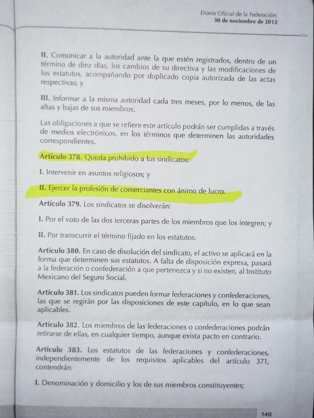 Sobre esto, la encargada de la Secretaría dijo”, se me hace grave el desconocimiento en el que está incurriendo (el NGS); hay dos cosas, si ustedes checan la Ley Federal del Trabajo en su publicado del 30 de noviembre del 2012, en el Artículo 378, sólo hay dos cosas que tienen prohibidos los sindicatos y una de ellas es, en la fracción segunda, ejercer la profesión de comerciantes con ánimo de lucro”.