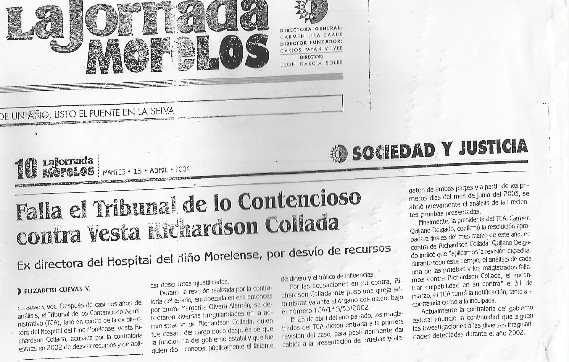 Ante esas graves acusaciones. Vesta interpuso una queja bajo el número TCA/1ªS/35/2002; sin embargo, dos años después las acusaciones fueron confirmadas por el Tribunal de lo Contencioso Administrativo (TCA). La presidenta, Carmen Quijano indicó “aplicamos la revisión expedita, durante todo este tiempo, el análisis de cada una de la pruebas y los magistrados fallaron contra Richardson Collada, al encontrar culpabilidad en su contra”.