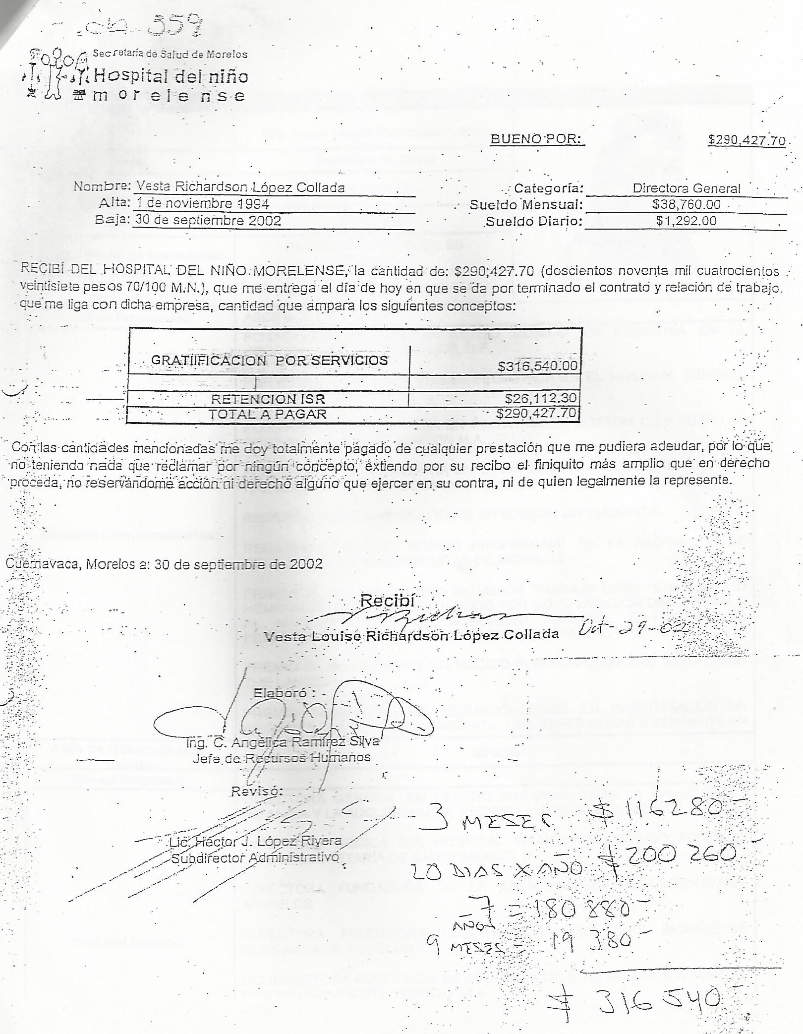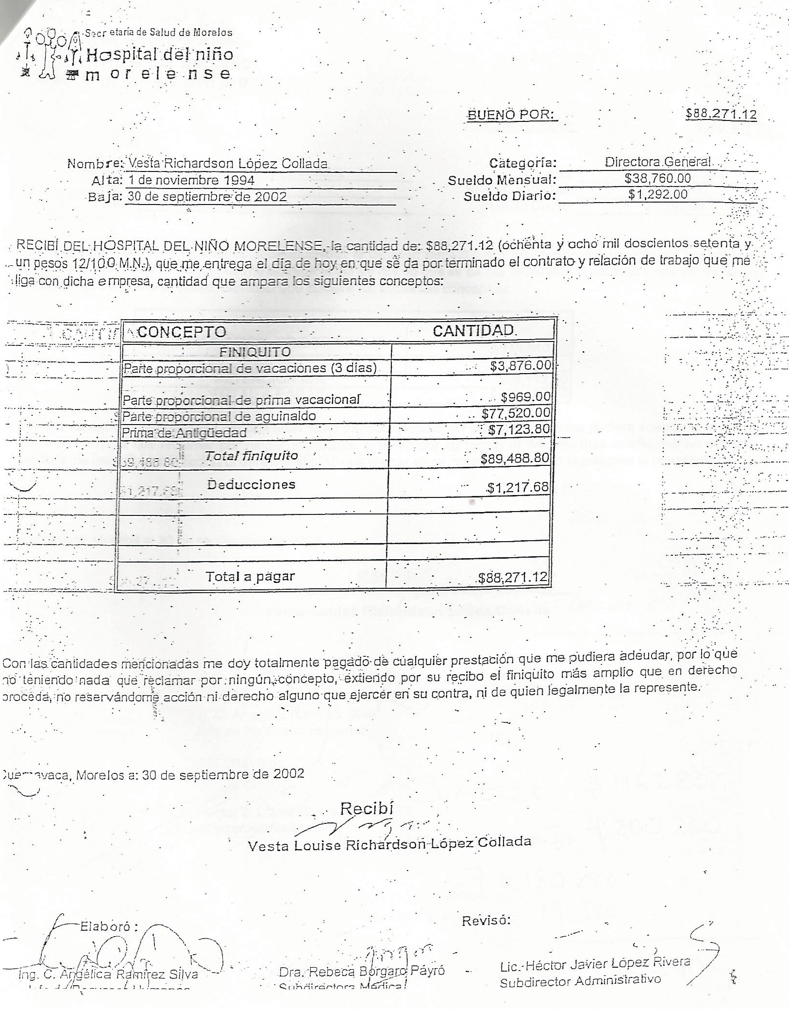 Pero eso no fue todo, a pesar de haber salido por desvío de recursos, se le finiquitó con 88 mil 271 pesos, lo que incluye la prima de antigüedad, como si se le hubiera despedido sin justificación alguna, su salario era de 38 mil 760 pesos mensuales. El monto fue por el periodo de trabajo 1994- 2002 y expresamente ella reconoce “me doy totalmente pagado”, como el documento lo indica.