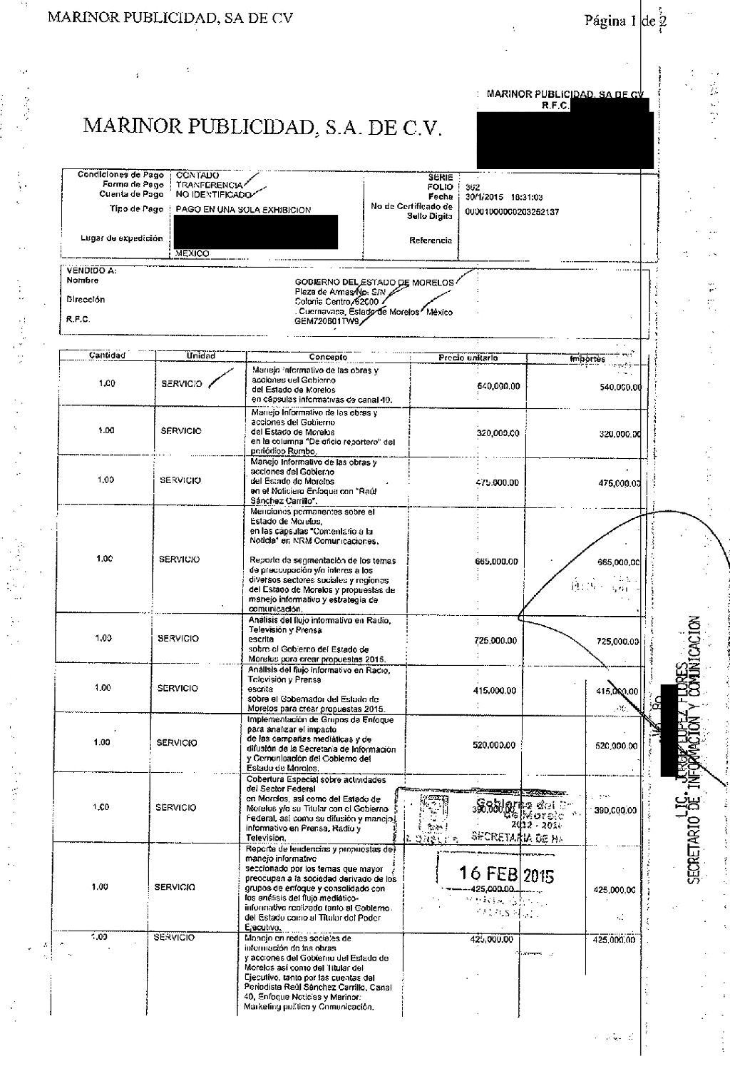 “Análisis del flujo informativo en Radio, Televisión y Prensa escrita sobre el Gobierno del Estado de Morelos para crear propuestas 2015”. Costo: 725 mil pesos.